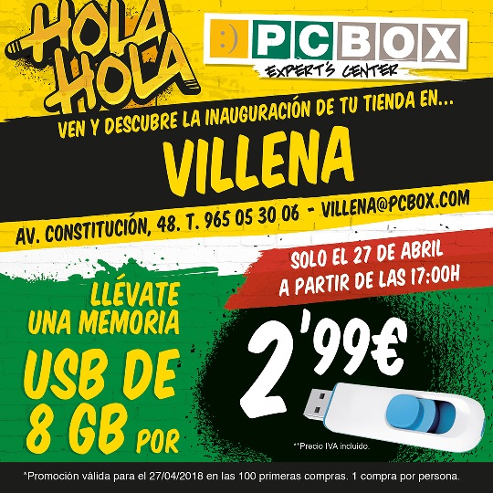 PCBox Villena se inaugura mañana viernes, día 27 de abril. Para celebrarlo y comenzar con el mejor pie, la nueva tienda ha preparado una magnífica oferta para los primeros clientes. Así, te puedes llevar una memoria USB de 8 GB por tan solo 2,99 euros. La campaña, vigente a partir de las cinco de la tarde del viernes, está limitada a 100 unidades. Ah, otra cosa: cada persona solo puede comprar una de estas unidades de memoria USB. ¡Te esperamos!